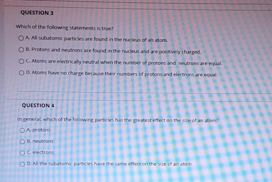 23 23 Which of the following statements about subatomic particles is TRUE. O Neutrons and electrons are found in the nucleus of an atom. Protons are positively charged and the lightest subatomic particle.